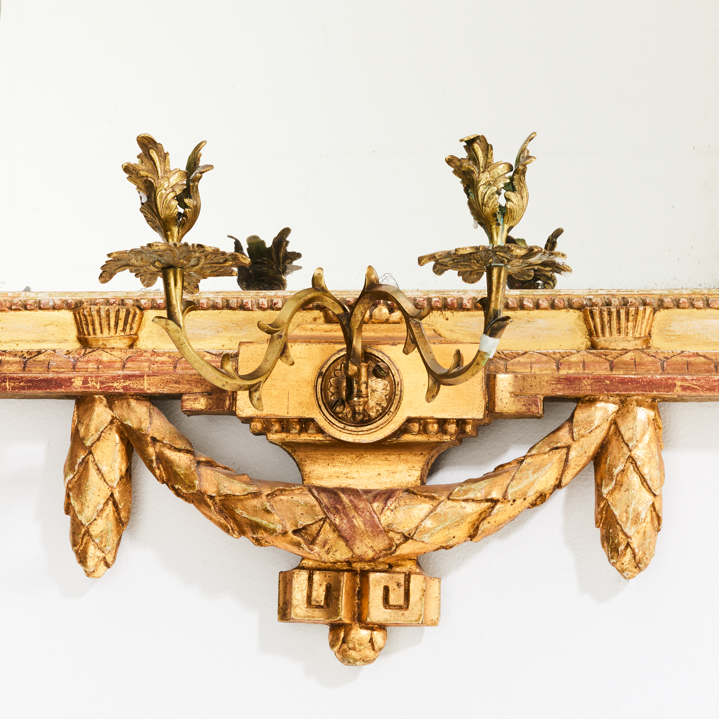 32,000 krSpegel högklassigt gustavianskt stockholmsarbete. Johan Åkerblads art. Bakstycke med otydlig påskrift. Skuren dekor. Ramverk med pärlstav. Genombrutet krön med parställda medaljonger behängda med rosenfestong. Krönt med vasakärve. Genombruten nederdel med lagerfestonger, rosett och rosenbukett. Förgylld. Tvådelat folierat glas. H c:a 200, B 76,5 cm.