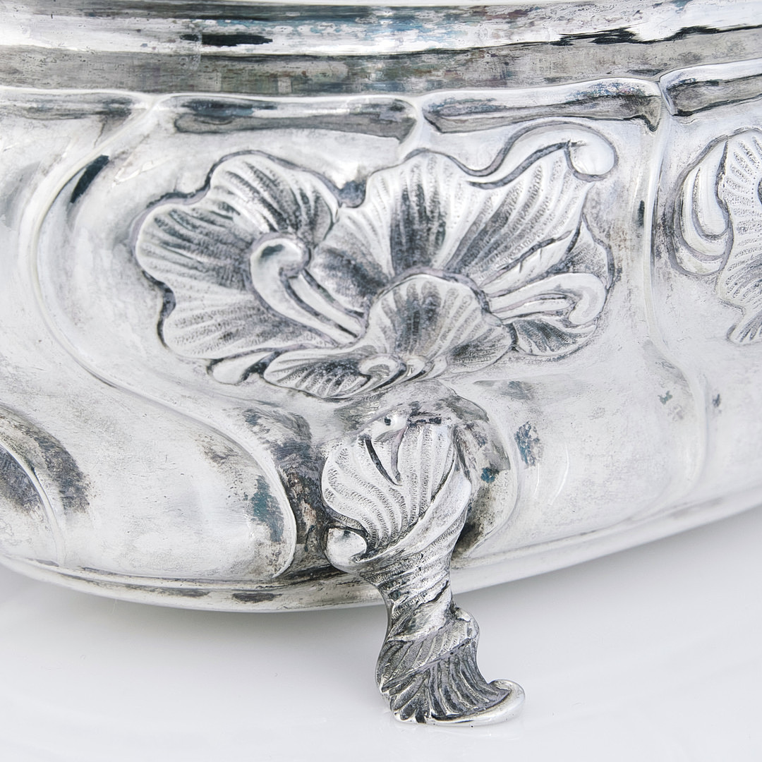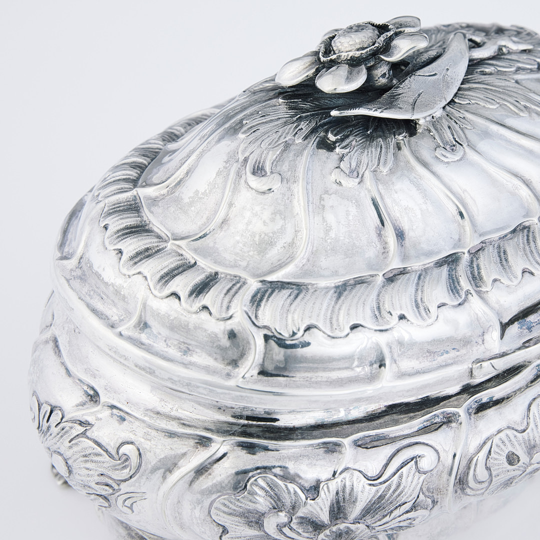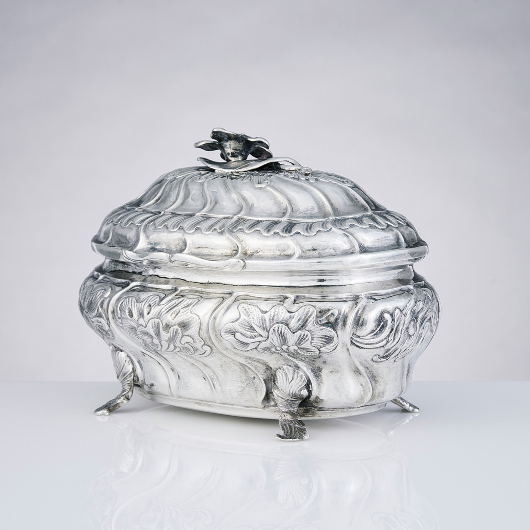 1764. Ovalt, svängt, på fyra bladfötter. rik dekor av svängda knäckar och drivna rocailler, fällbart lock med liggande blomsterkvist. Längd 17 cm, vikt 360 gram.