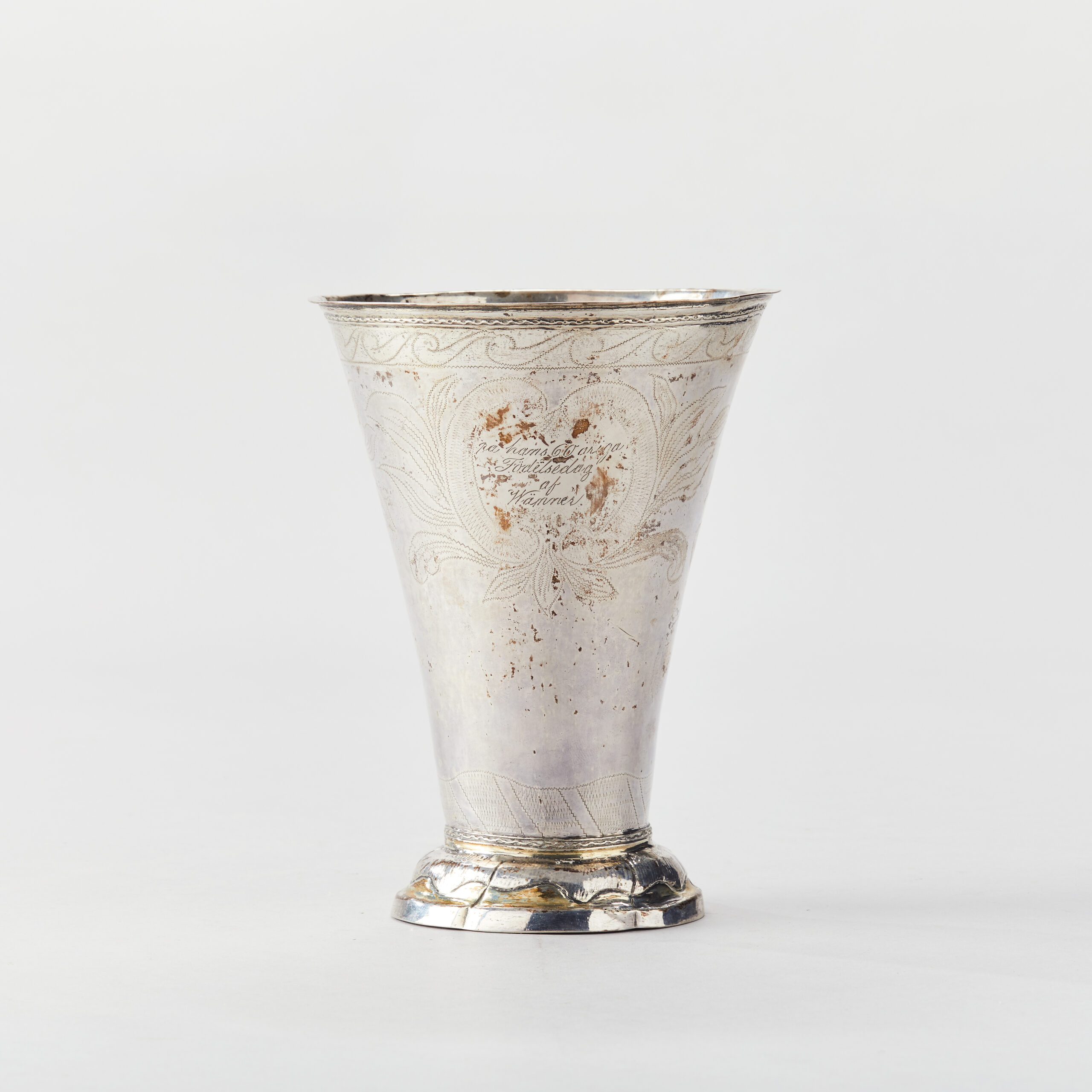 Bägare Erik Lemon, Uppsala 1787. Konisk form. Svisselerad dekor. Invändigt förgylld. H 20,5 cm. Vikt ca 350 g.