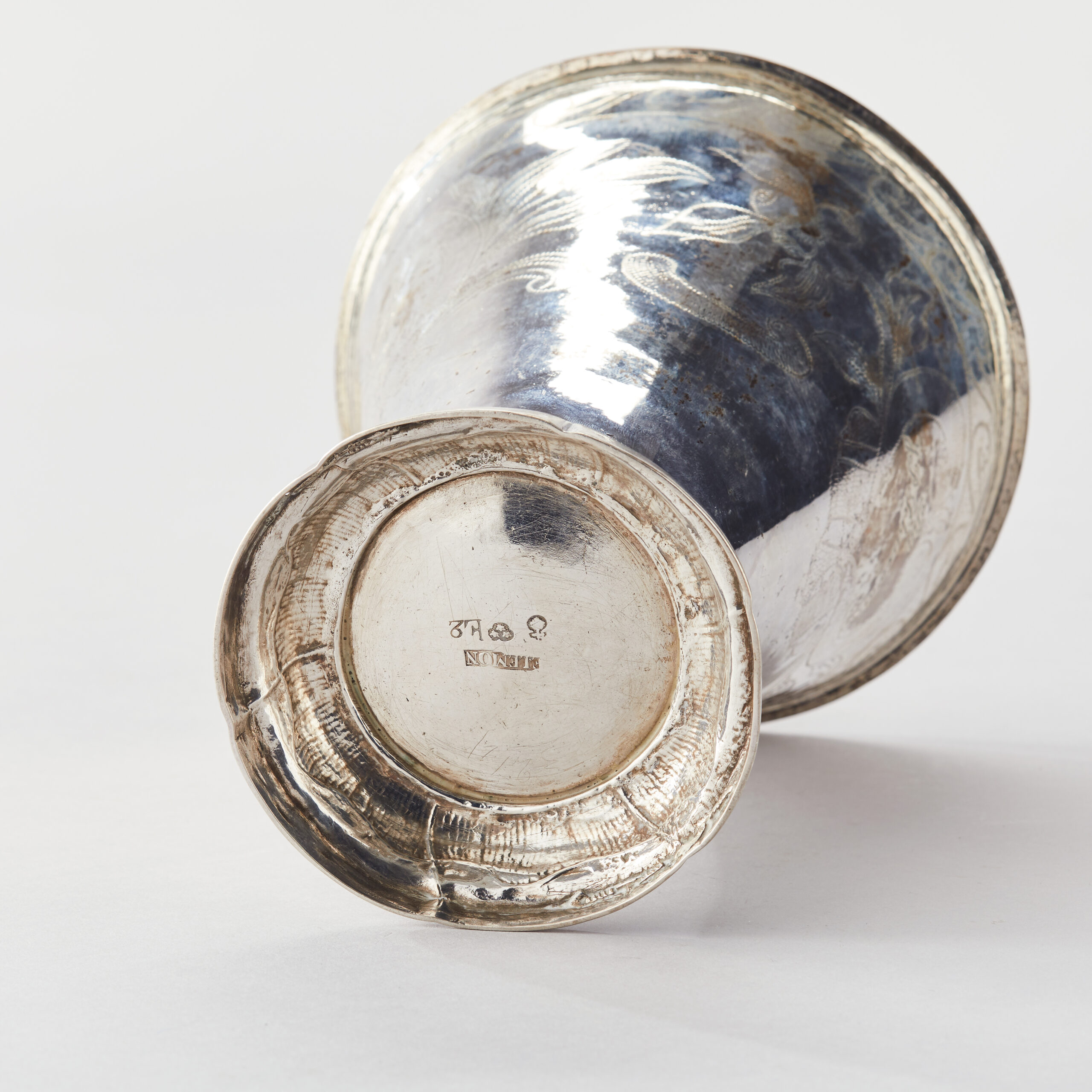 8,000 krBröllopsbägare silver. Sven Nyberg, Varberg 1759. Graverad dekor. Bär monogram “POS” “AAD” “1792”. H 18,5 cm. Total vikt ca 210 gram.