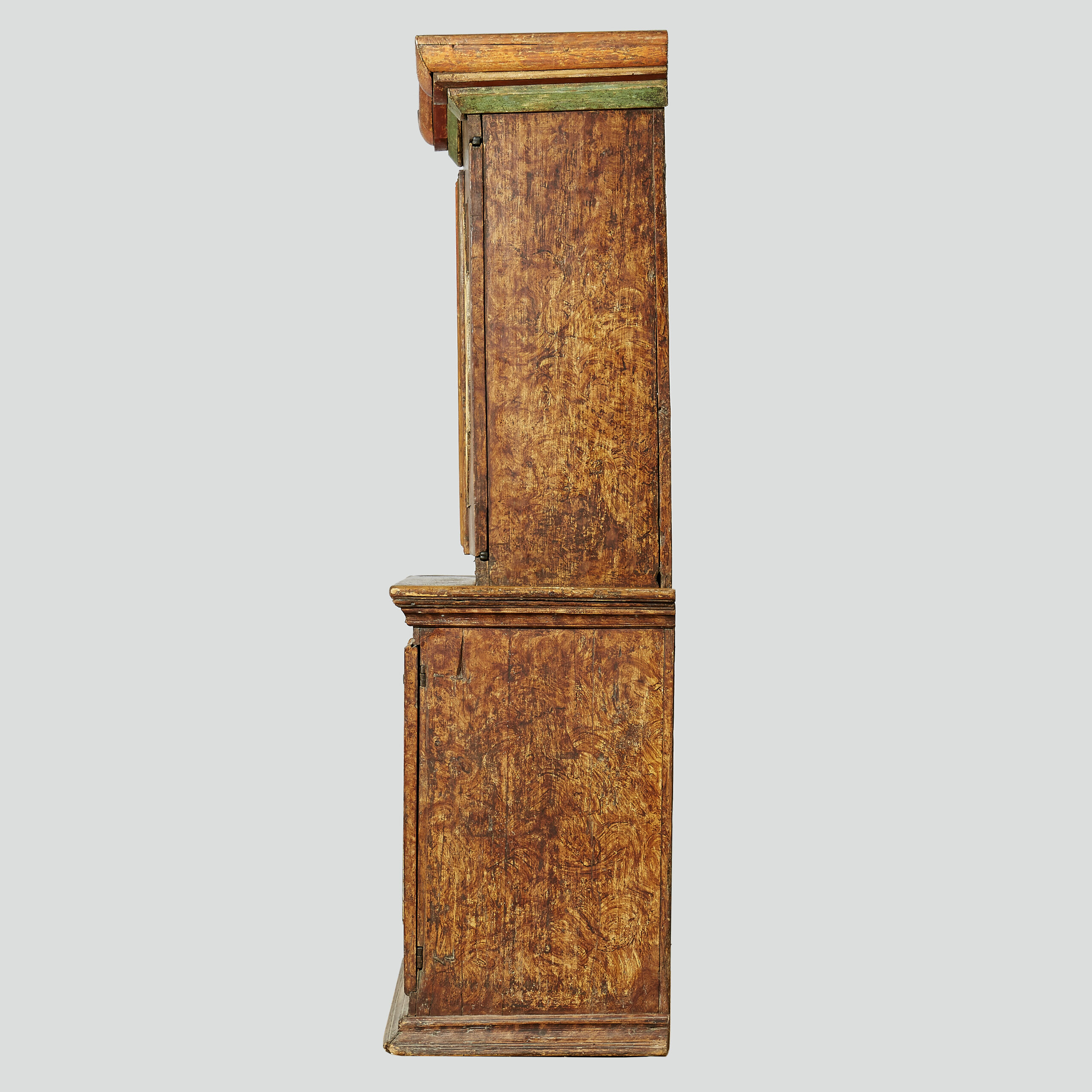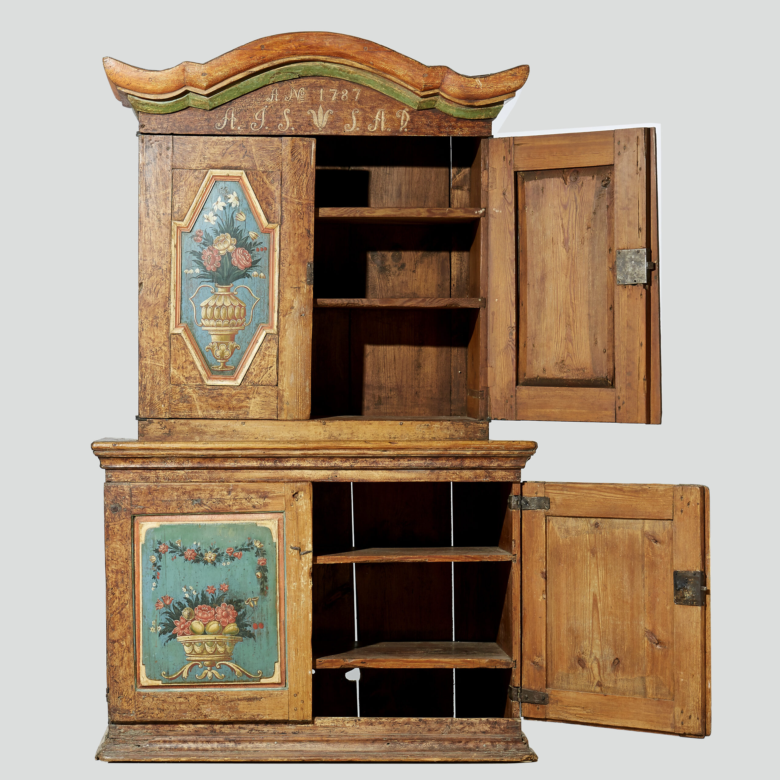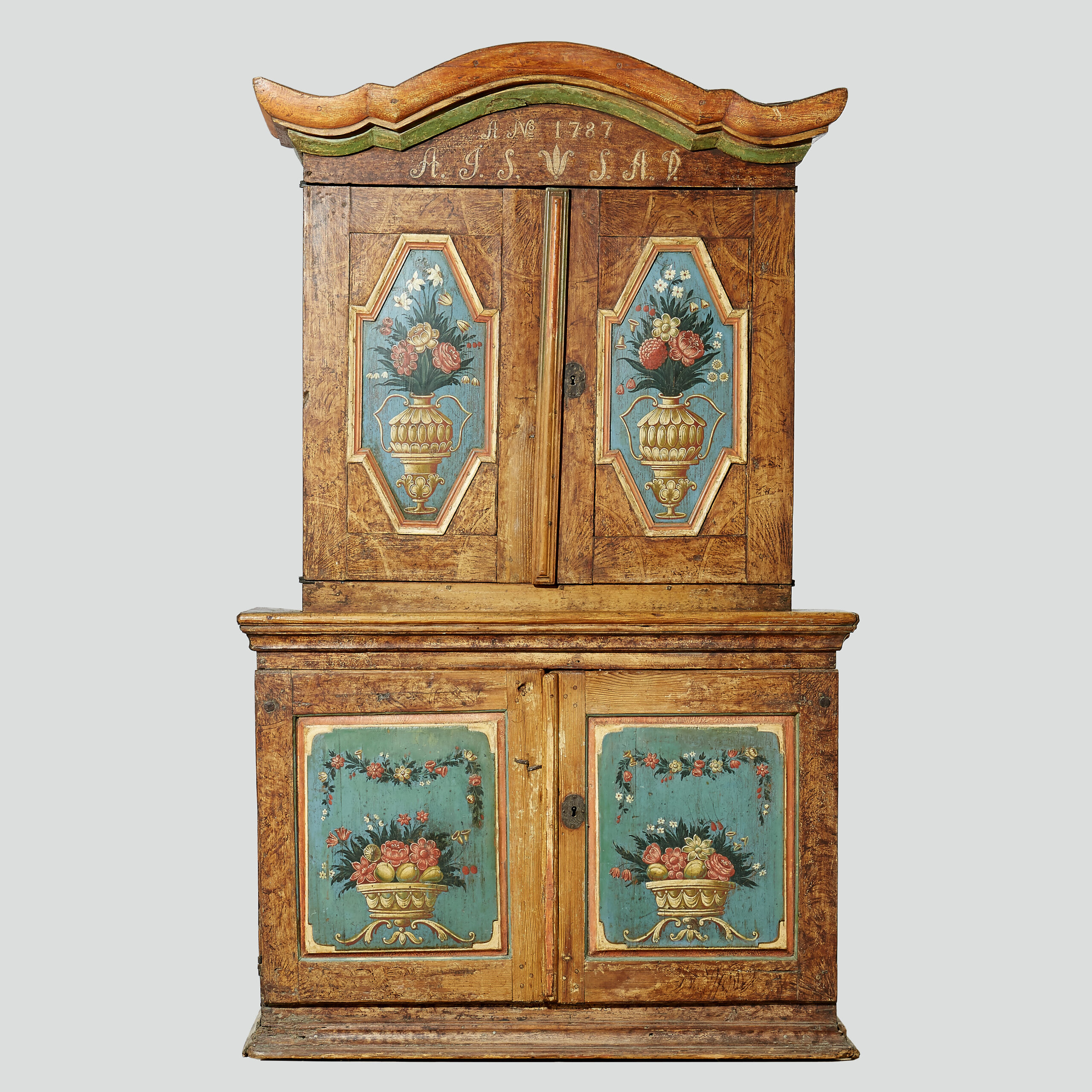 Skåp Allmoge. Daterat Ano 1787. Med dubbelmonogram A.I.S S.A.D. Originalmålad dekor i dörrspeglar av urnor med blomster mot blå bakgrund. Invändigt med hyllinredning. L 124, B 55, H 208 cm.