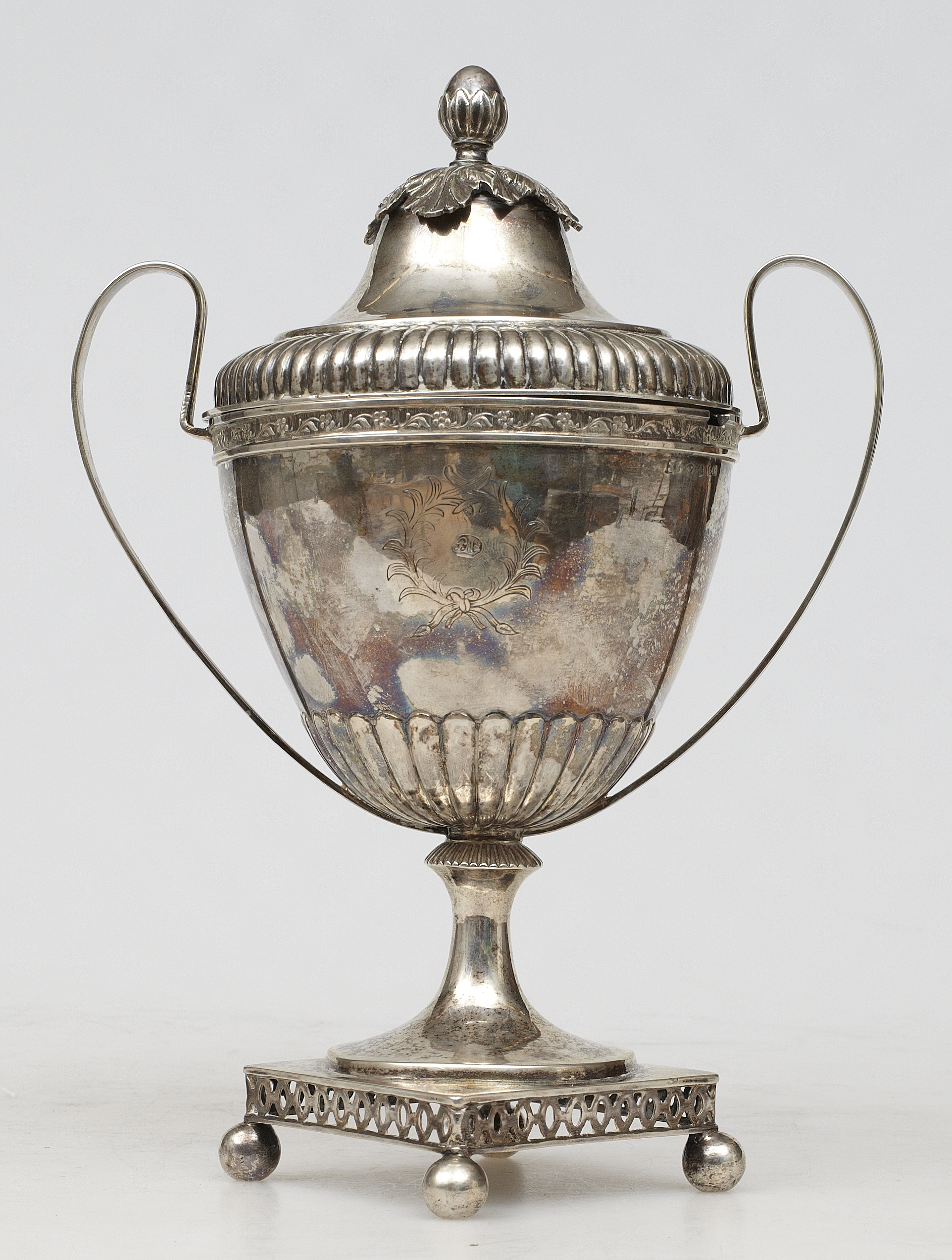 16,000 krStrösockerskål Johan Malmstedt, Göteborg 1796. Urnformad med uppsvängda hänklar. H 25 cm. Vikt ca 590 g.
