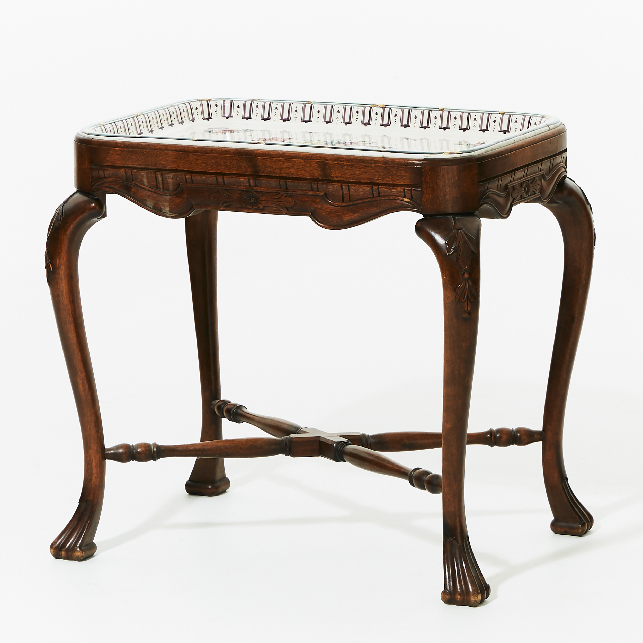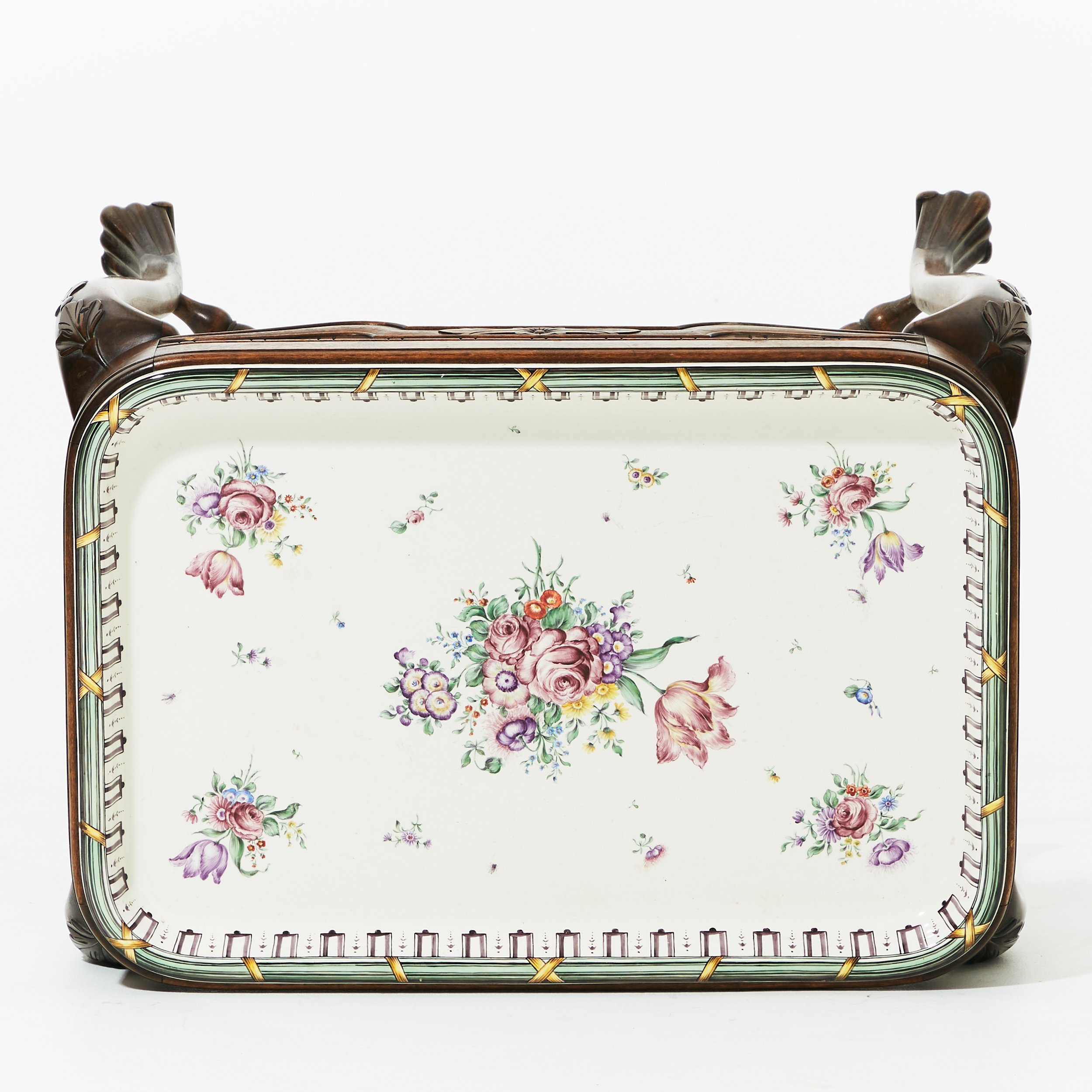 Tebord rokokostil. Skiva i flintgods märkt Rörstrand 1926 A.S. Polykromt bemålad dekor av spridda blomster. L 77, B 55, H 72 cm